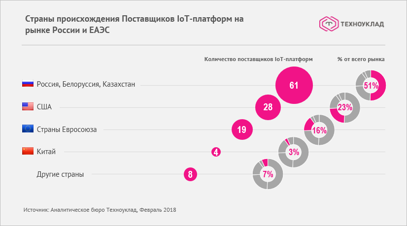 Страны происхождения Поставщиков IoT-платформ на рынке России и ЕАЭС. Источник: Аналитическое бюро Техноуклад, 2018